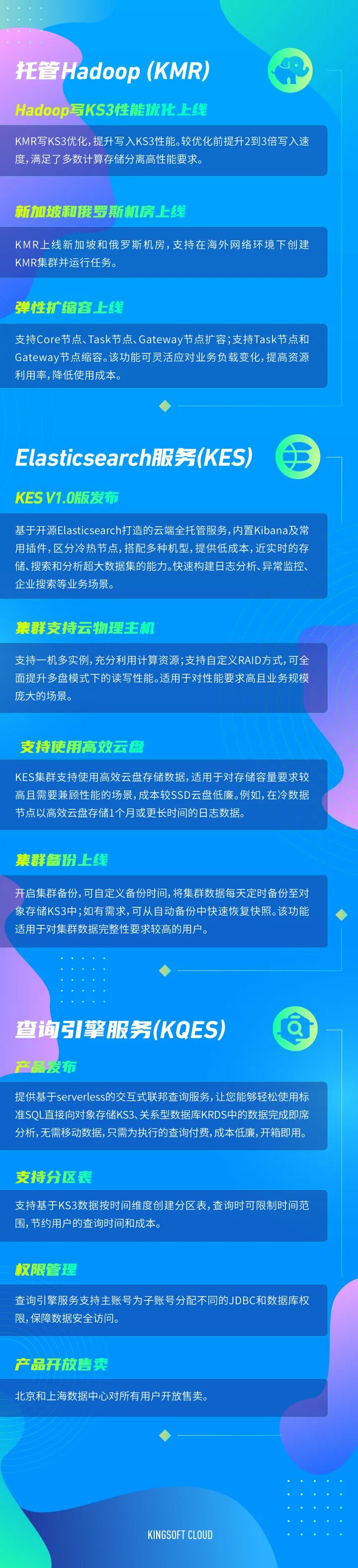 继金山云公布2020年上半年在计算、安全、网络、存储系列产品功能升级后,此次金山云大数据类产品的功能升级包含托管Hadoop(KMR)、Elasticsearch服务(KES)、查询引擎服务(KQES)三款产品: