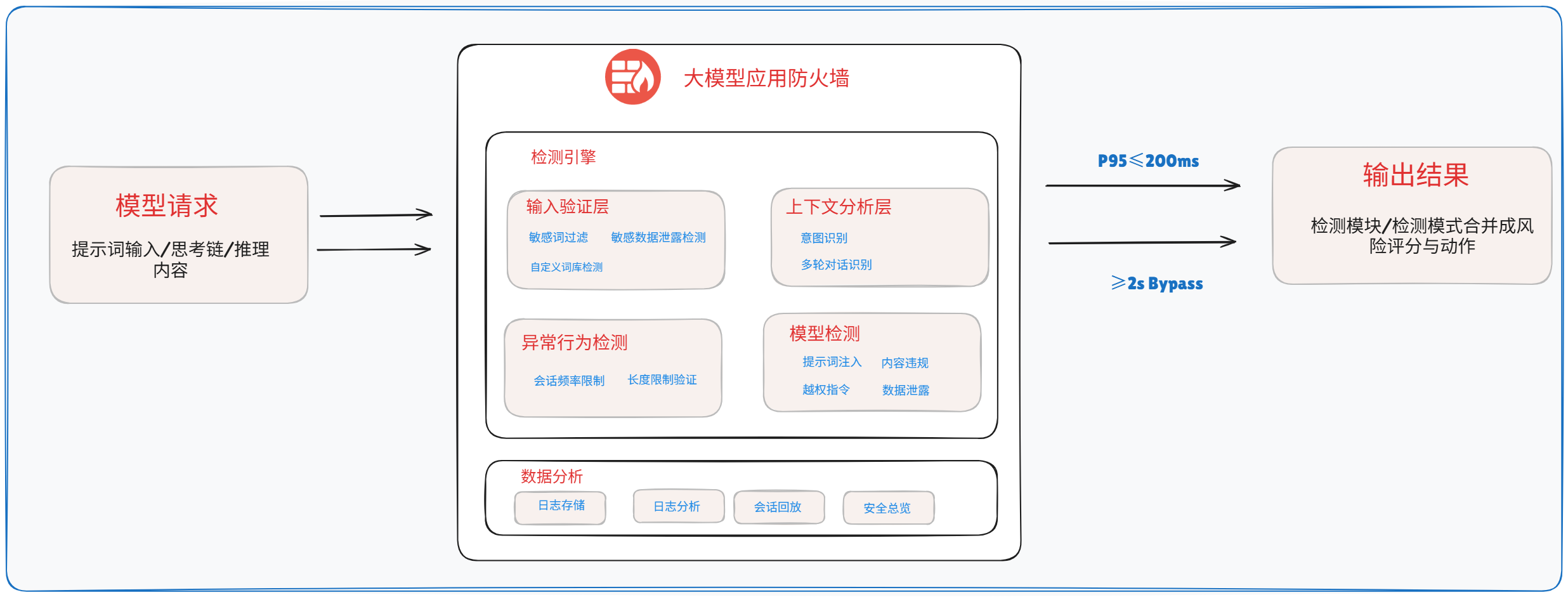 融合关键字、语义与模型分析,对输入/输出内容进行实时检测与流式处理,平均延迟<200ms,精准拦截违规内容与攻击;