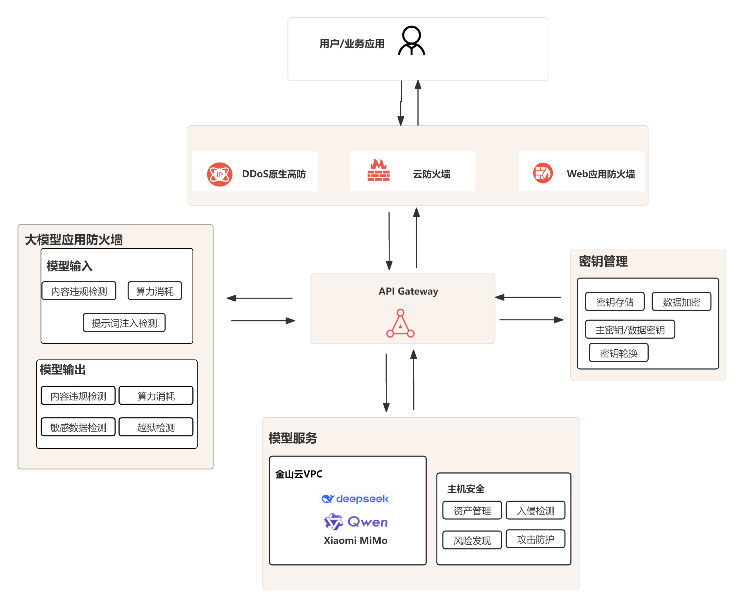 金山云大模型安全性解决方案深度融合大模型应用防火墙(MAF)、WAF、主机安全、原生高防、密钥管理等核心产品,为模型的输入与输出提供全链路安全保障,实现对恶意流量、违规内容及敏感数据的一体化管控,为客户筑牢AI时代的“安全底座”。