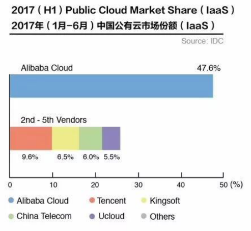 不过,由于云计算特别是公有云进入壁垒高,与国外公有云发展规律类似,国内云计算马太效应也逐渐明显,形成了资源向头部聚集、巨头领衔行业发展的格局。据《IDC 2017年上半年中国公有云IaaS市场份额调研报告》显示,阿里云、腾讯云、金山云位列前三,合计占据了中国公有云63.7%的市场份额。