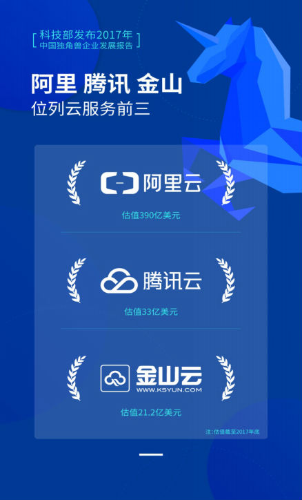 3月23日上午,科技部在北京发布《2017年中国独角兽企业发展报告》,共有164家企业入围独角兽榜单。报告显示,作为高精尖技术行业代表之一的云计算,涌现出多家独角兽企业。截至2017年底,阿里云、腾讯云、金山云估值分别达到360亿美元、33亿美元、21.1亿美元,位列云服务行业前三。