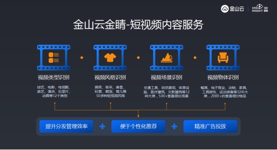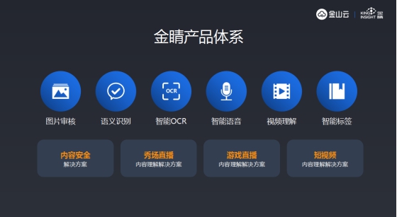 金山云一直积极推动AI技术的产品商业化应用,在计算机视觉与图像、智能语音识别和自然语言处理这三类人工智能的典型场景进行了大量的技术研发投入,其中一站式 AI内容服务——“金睛”是商业应用的典范。