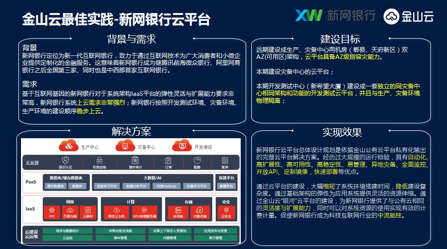 在安全合规方面,作为金融服务的第一要义,金山云除了提供合规、安全、稳定的云服务,金山云金融专区云—— “银河云”平台为金融客户提供端到端的金融上云服务,如上云迁移、灾备咨询、监管评估等,形成内外网、多层次立体信息化安全防护体系。