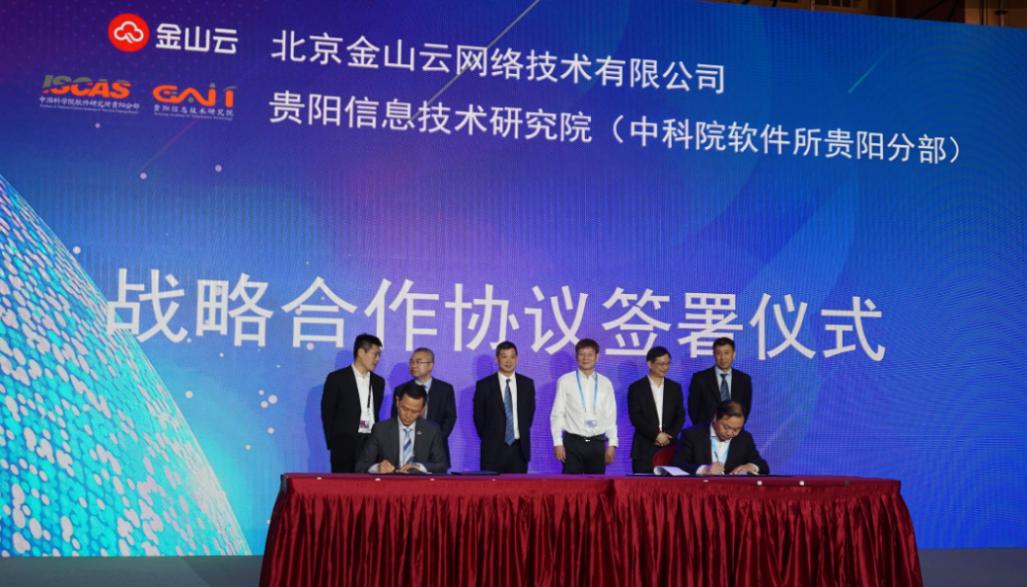 金山云副总裁宋晓伟(前排左一),贵阳信息技术研究院(中科院软件所贵阳分部)常务副院长陈峰(前排左二),拜特科技创新事业部副总经理张剑(前排右一)签署战略合作协议