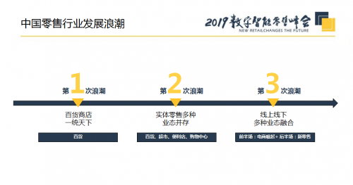 “在今天看来,零售业的发展有三次浪潮”,于涛在演讲中表示,第一次浪潮由百货商店一统天下,第二次浪潮,衍生出了百货商店、大型超市、购物中心、线下门店等多种业态。第三次浪潮的前半场的主角是快速崛起的电商平台,后半场的主角则是新零售,“转型新零售,这可以说是零售业的发展方向”。