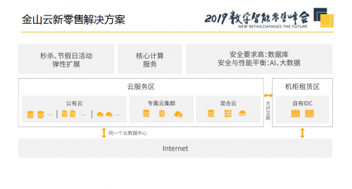 针对客户的业务需求,于涛介绍说,金山云提供的全云新零售解决方案,面向秒杀、节假日活动,可提供弹性、敏捷、高可用等能力为业务做支撑。针对业务对高性能、安全有严格要求和高隔离型诉求的企业,金山云提供专属云机器,提供独享宿主机资源,客户无需采购物理机,一站式在线购买和使用,无需机房运维投入,让客户更专注业务,最大限度地节省成本。