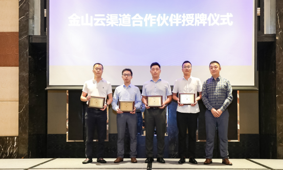 金山云渠道生态合作部总经理柴俊平(右一)为四家合作伙伴授牌