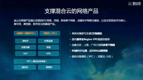 在实际应用中,混合云的优势很大程度上需要靠网络来体现,更高效的传输网络和更优良的处理效率对于混合云至关重要。“金山云网络产品以VPC为核心,打造出了弹性IP、负载均衡、NAT,以及对等连接、专线、VPN等与VPC相关的网络产品,包括云解析、智能NDS以及托管云。”张宇讲到。“金山云在核心网关和控制器方面100%采用自研,支持分钟级网络环境自主化部署,能够极大提升网络效率”。接着张宇从专线互联、VPN、云物理机和专属云四个层面进行了详述。