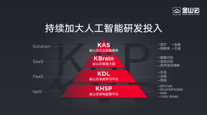在PaaS层,金山云深度学习平台KDL是国内云计算企业中首个实现商用的人工智能云PaaS平台,为客户提供开发、评估、训练、预测等支持,帮助客户快速接入AI能力。KDL支持私有化部署,面向大企业、高校等对于AI的需求,当前已经和数十家大型企业展开了合作,通过在底层提供基于AI的PaaS平台,统一维护GPU资源并且提供上层研发支持。