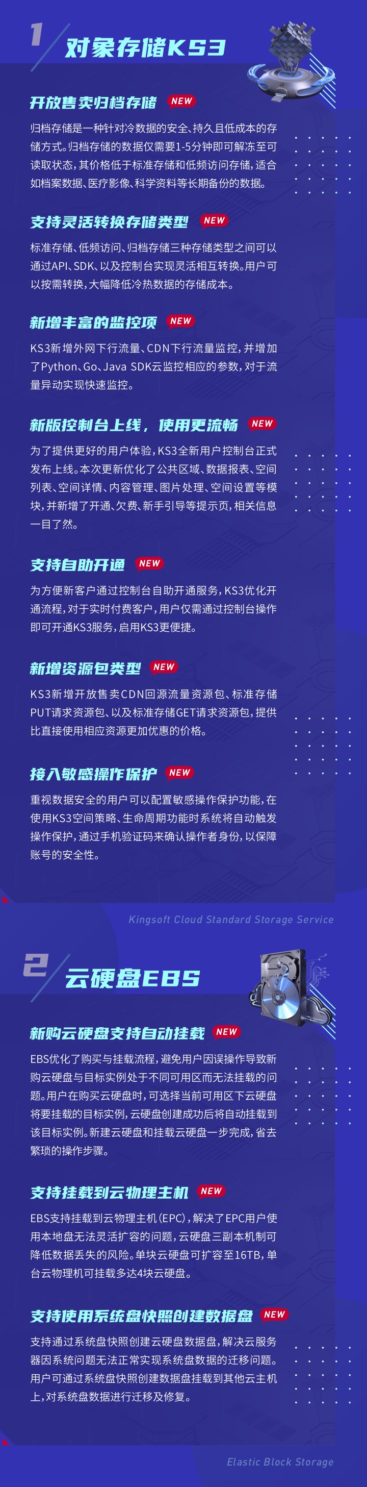 其中,对象存储KS3(Kingsoft Cloud Standard Storage Service)解决存储扩容、数据可靠安全以及分布式访问等相关复杂问题,用户可以使用KS3,便捷地存储和获取图片、音频、视频、文本等各类数据文件。