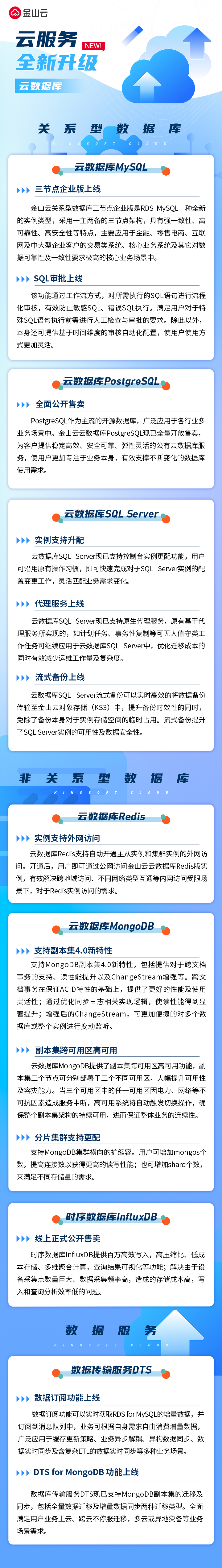 金山云作为我国知名的独立云服务商,也在不断加大在数据库方面的研发投入,拥有高可用、高安全、高性能的三大产品优势。