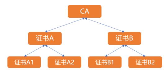 (最顶部的是CA“根证书”,除了根证书,其它证书都要依靠上一级的证书,来证明自己。例如,CA信任A和B,然后A信任A1和A2,B信任B1和B2,从而构成了证书链。)
