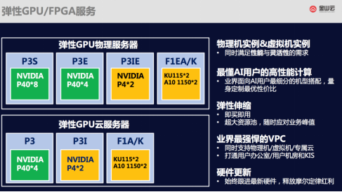在弹性GPU/FPGA服务方面,金山云提供了基于EPC的GPU服务器和基于KEC的GPU服务器两种产品形式,同时满足性能与灵活性的需求。此外,利用业界领先的的VPC网络,不仅可以连通用户在金山云上的物理服务器和云服务器,还可以方便连通用户自己在金山云其他区域的服务,实现计算能力的按需调配和灵活扩展。