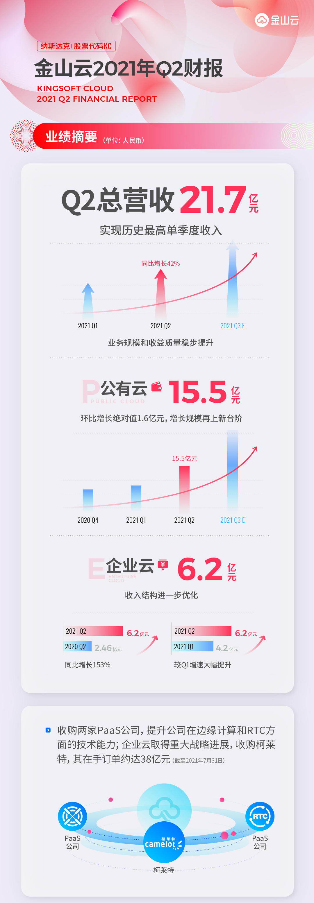刚刚,金山云发布2021Q2财报!总营收21.7亿元,单季收入创新高,同比增长42%,业务规模和收益质量实现稳步提升!