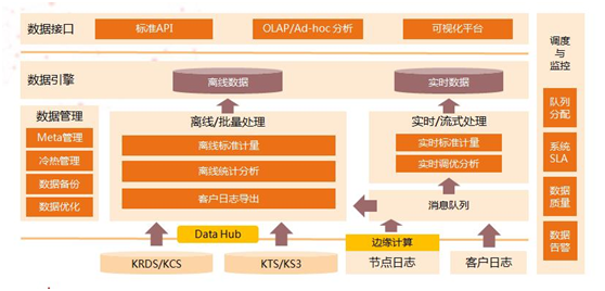 在数据的前处理上,金山云采用的是实时流+离线流修补的经典架构,实时流在一定精度的前提下,保证了数据的及时性,离线流保证了数据的最终完整性。此外,平台还引入了边缘计算,作用是在充分利用CDN节点分布式天然优势的同时,可大大降低中心数据平台的压力,提升了平台的整体稳定性。