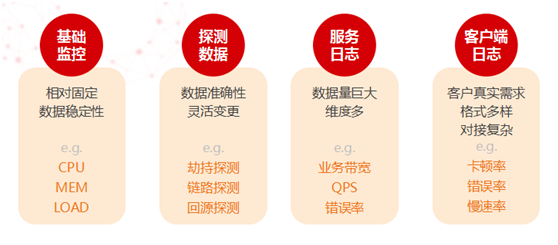 现有数据可以分为四类。包括基础监控数据、探测数据、服务端日志、客户端日志,这四类数据在接入难度、数据量级上各不相同,数据平台需要统筹考虑所有数据的接入、传输、计算和存储。