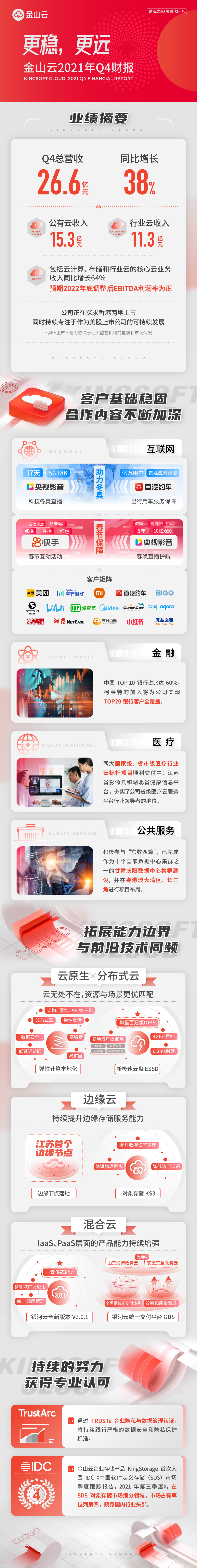 3月24日,金山云发布2021年第四季度财报,总营收26.6亿元,同比增长38%。