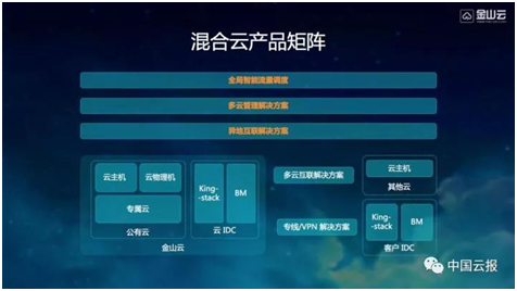 在混合云产品层面,金山作为国内最早提供全Region VPC化服务的云厂商,打造了集全局智能流量调度、多云管理解决方案及异地互联解决方案于一体的混合云产品矩阵,帮助用户在最大程度地利用已有IT基础架构的前提下,提高IT效率,简化部署和快速应对业务的变化。
