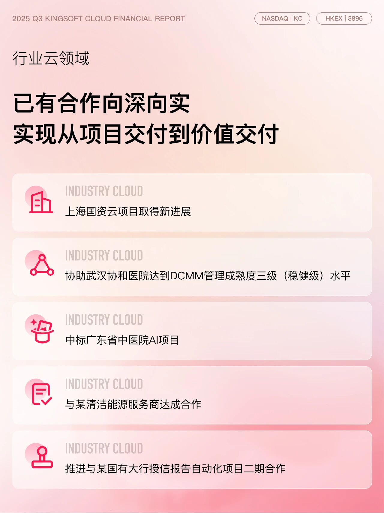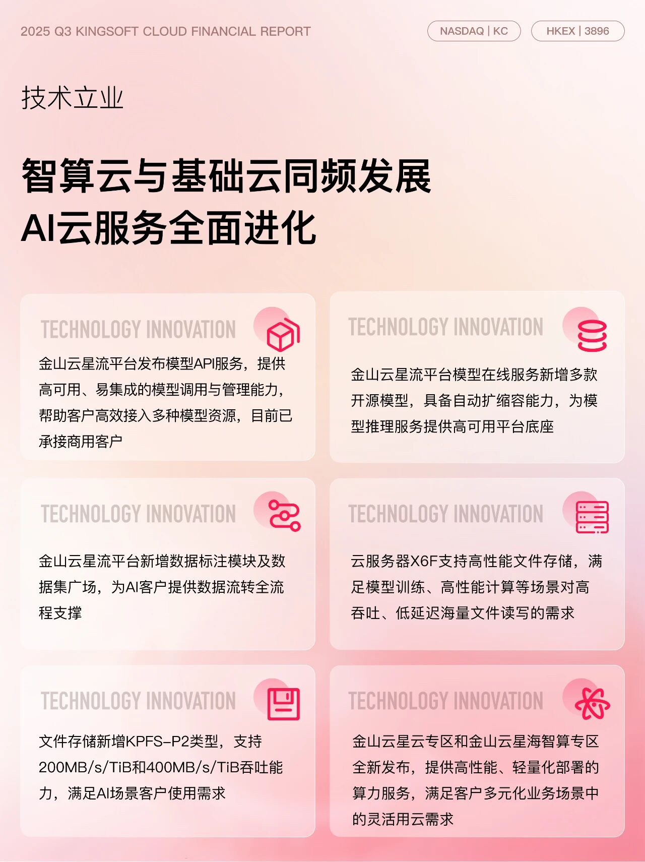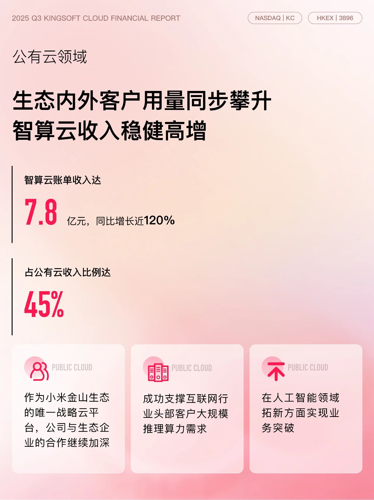 作为小米金山生态的唯一战略云平台,公司持续为生态企业提供优质服务,夯实智算需求的快速响应能力。本季度,来自小米金山生态的收入达6.9亿元,同比增长84%,占总收入比例进一步提升至28%。2025年1-9月