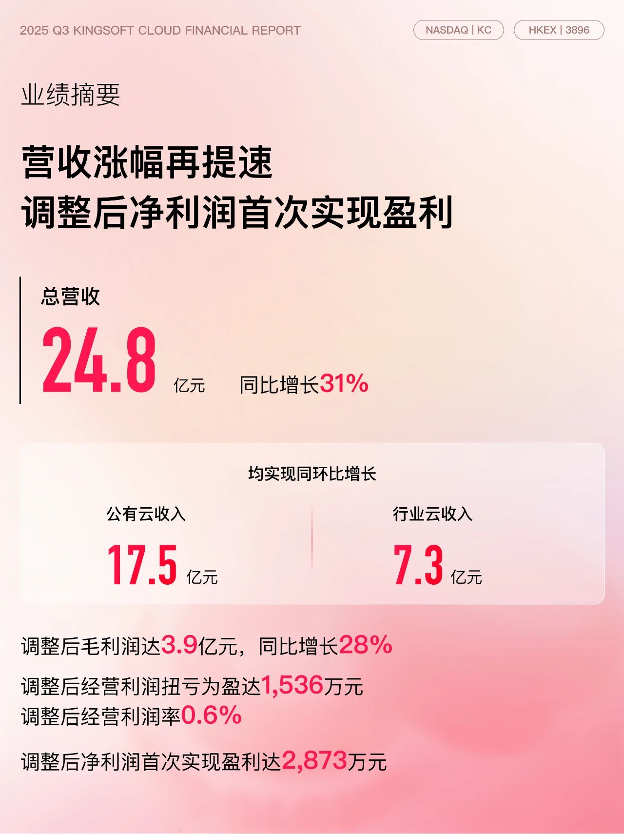 财报显示,金山云Q3营收24.8亿元,同比增长率由上季度的24%再次提速至31%。本季度,公有云实现收入17.5亿元,行业云实现收入7.3亿元,均实现了同环比增长,其中公有云同比大幅增长49%;调整后毛利润达3.9亿元,同比增长28%;调整后经营利润扭亏为盈达1,536万元,调整后经营利润率0.6%;调整后净利润首次实现盈利达2,873万元。季度内,智算云账单收入达7.8亿元,同比增长近120%,在公有云收入占比达45%。